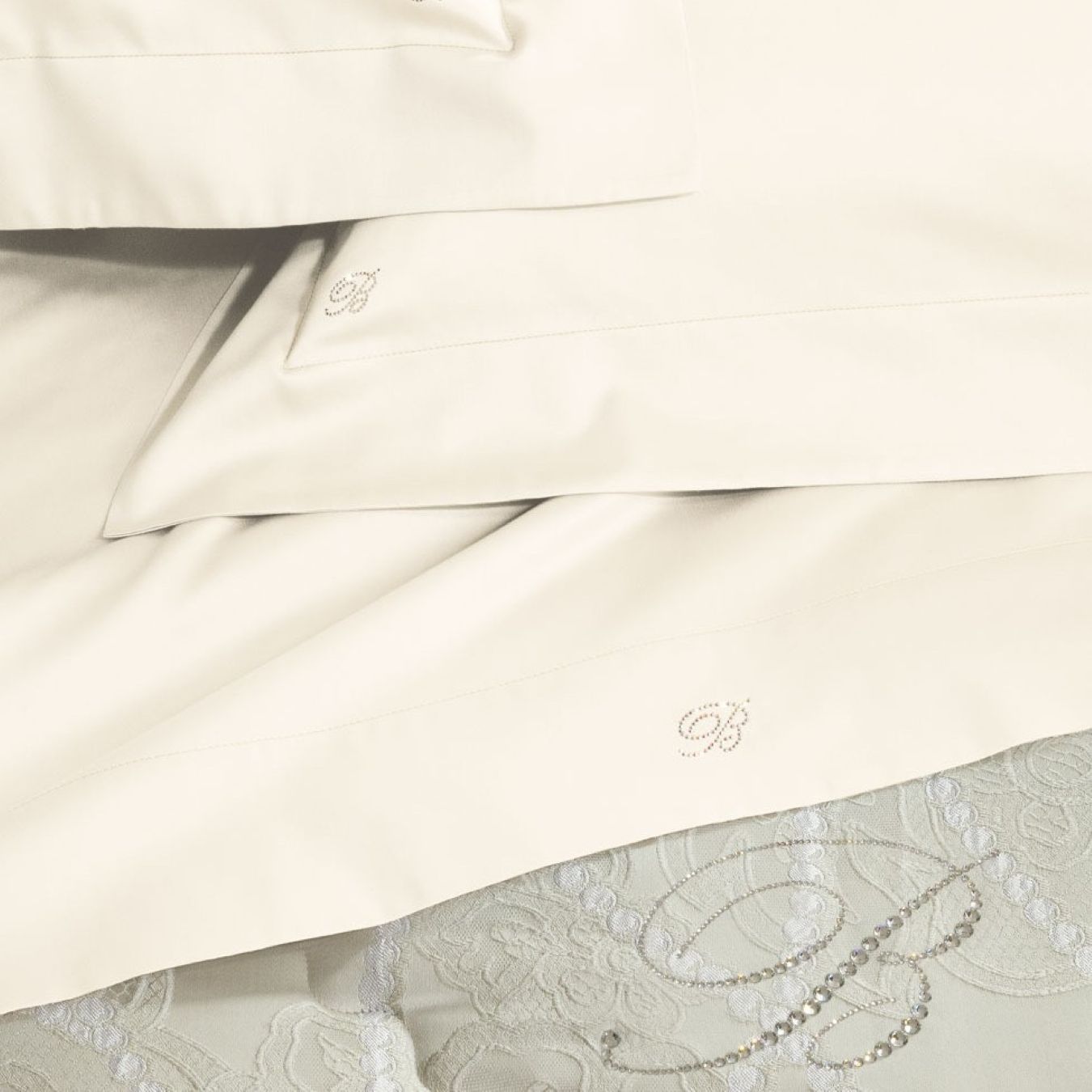 -Applicazione in cristalli Swarosky sulla federa a 3 volani e sul lenzuolo di sopra